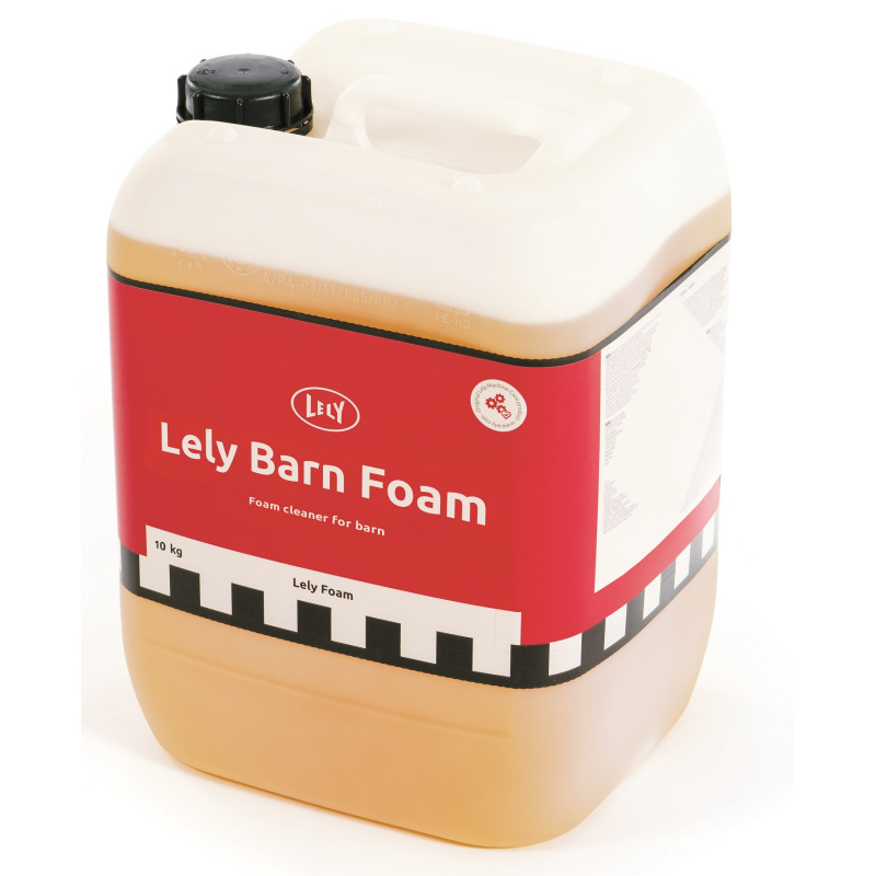 "Lely Barn Foam is een schuimend, sterk zuur reinigingsmiddel. Het belangrijkste ingrediënt is methaansulfonzuur dat ongeëvenaarde kalkverwijdering biedt. Het product is niet alleen fosfaatvrij maar ook zeer laag in stikstof. Het zorgt voor een beter schuimgedrag en dus een optimale hygiëne. Het verwijdert minerale afzettingen, zoals kalksteen, ijzer, melksteen en urine in de stal, melkruimte, robotgebied en melkstal. Dit product kan gebruikt worden in de Lely Foam Unit en andere lagedruk (schuim)systemen. Gebruiksaanwijzing: Concentratie: 1 tot 10%. Contacttijd: 5 tot 15 minuten. Oppervlakte vochtig houden, goed naspoelen met water. Nieuw product o.a. ter vervanging van RECA Melkstalreiniger.
